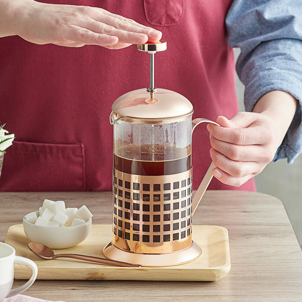 This 33 oz coffee press is a regular good cheap alternative to the super expensive coffee presses. The filter is really good, and does not bend or move when you push the lever down. Most importantly it is very easy to clean, and coffee grime does not get stuck on indefinitely.