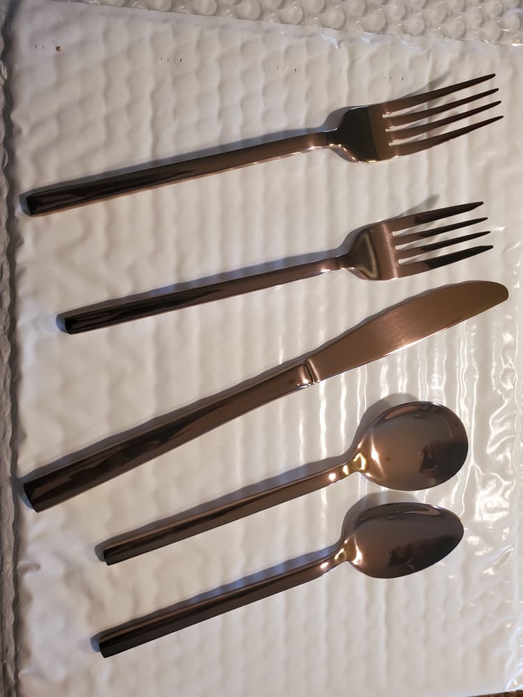 The color on these are amazing!! Beautiful shine and great weight in the hand. The narrow lines give a good grip! Beautiful set!