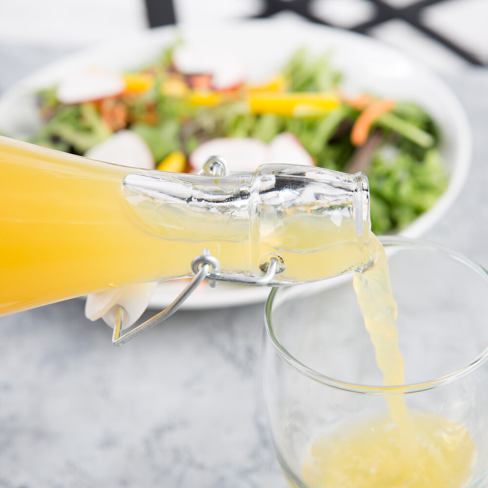 The Acopa 32 oz. Clear Glass Bottle with Wire Bail Swing Top Lid (6/Case) is a stylish and functional choice for serving beverages in restaurants, cafes, or catered events. Made from lead-free, durable glass, its crystal-clear construction showcases contents like juice, water, or infused oils, enhancing presentation while ensuring easy identification. The 32 oz. capacity is ideal for table service, reducing refill frequency, and the wire bail swing top lid provides a hermetic seal to lock in freshness and prevent spills.