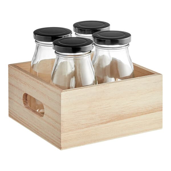 (12) 6 oz. Glass Milk Bottles with (12) Lids and (3) Wooden Crates