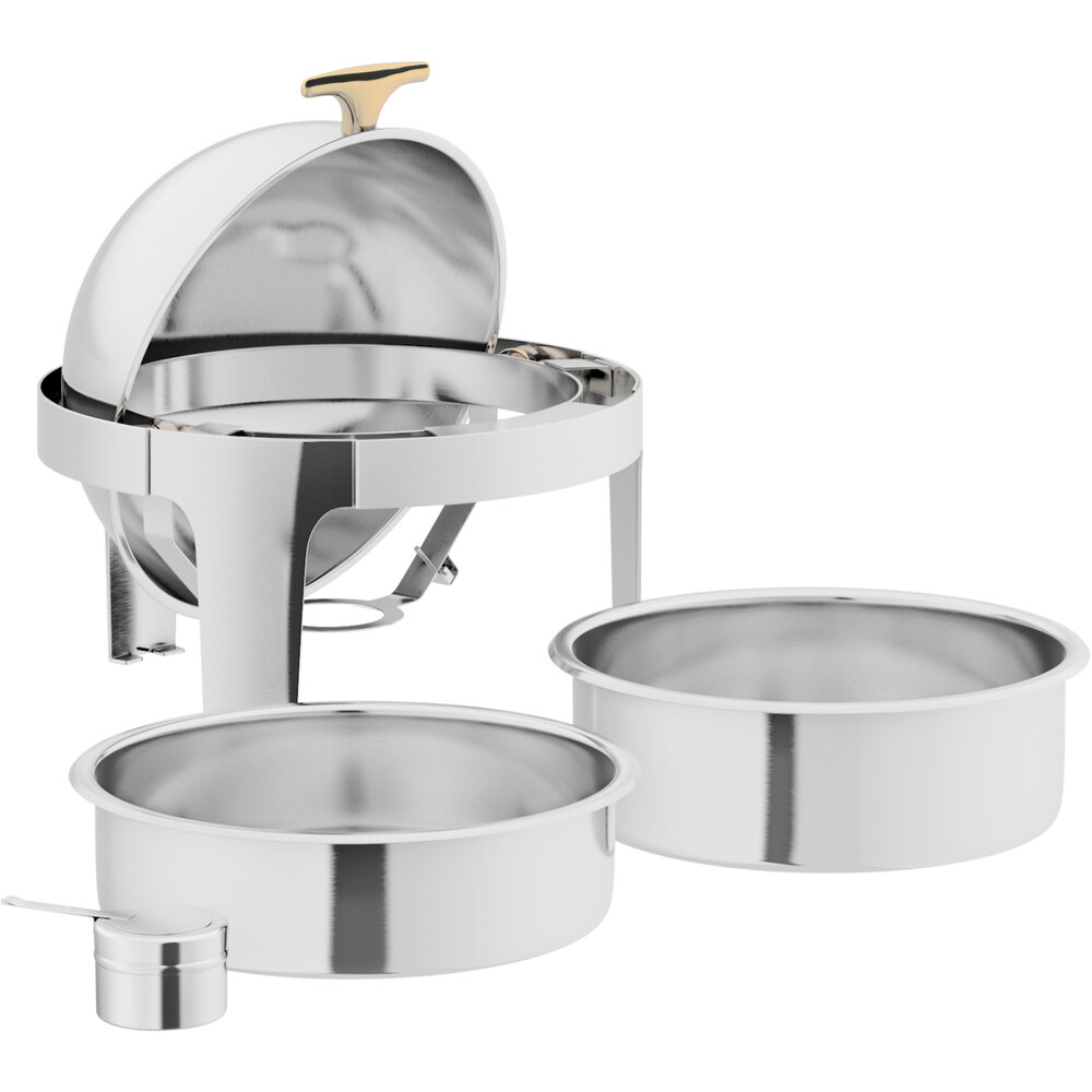 The Acopa Supreme 6.5 qt Round Gold Accent Roll Top Chafer Dish is an exemplary product that consistently receives positive feedback from our customers. They value both the ample size and the superior quality of this item. Additionally, the gold handle enhances the overall aesthetic appeal of the design.
